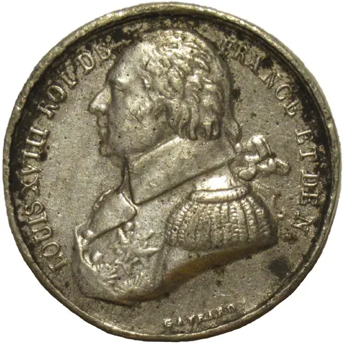 | توضیحات روی مدال | Dressed bust of King Louis XVIII on the left. Royal title around, and engraver`s signature below. |