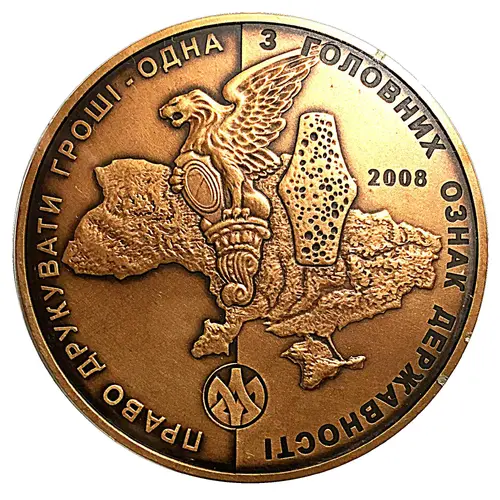| Leyenda del anverso | ПРАВО ДРУКУВАТИ ГРОШI - ОДНА 3 ГОЛОВНИХ ОЗНАК ДЕРЖАВНОСТI 2008 (Translation: Right to money issuing - one of the major sigh of state) |