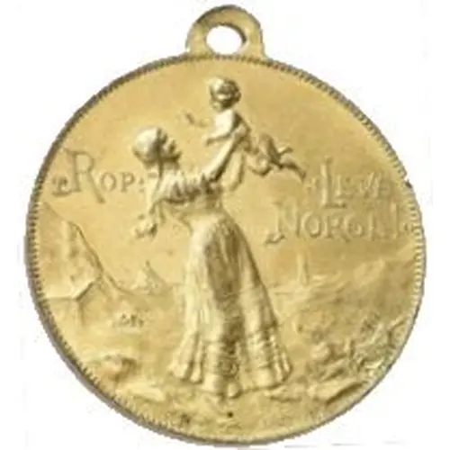 | Obverse description | Woman holding child, inscription at sides. Fishing and farming town mountainous landscape, beaded ring on the rim. |