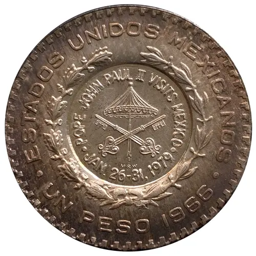 | Obverse lettering | ESTADOS UNIDOS MEXICANOS Counter stamped Papal Seal `Pope John Paul II Visits Mexico Jan. 26-31, 1979` and the initials “MRW” (designer Mel Wacks) UN PESO 1966 |