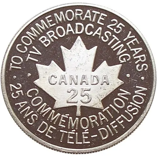| Obverse lettering | TO COMMEMORATE 25 YEARS TV BROADCASTING CANADA 25 COMMÉMORATION 25 ANS DE TÉLÉ-DIFFUSION |