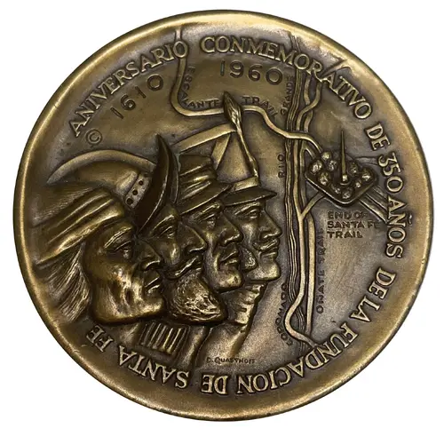 ANIVERSARIO CONMEMORATIVO DE 350 AÑOS DE LA FUNDACION DE SANTA FÉ 1610 1960 ESCALANTE TRAIL RIO GRANDE END OF SANTA FE TRAIL CORONADO OÑATE TRAIL D.QUASTHOFF (Translation: Commemorating the 350th anniversary of the founding of Santa Fe) |