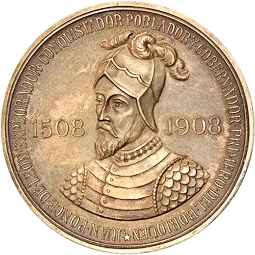 | Obverse description | Helmeted, mailed bust of Don Juan Ponce de Leon, later explorer of Florida facing left. |