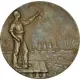 Man standing on a pontoon with an olive branch in one hand and a hammer in the other. In the background the shipbuilding establishment at Triest, the battleship S.M.S. Erzherzog Ferdinand Max, sun with rays and a sea mine in the water. |