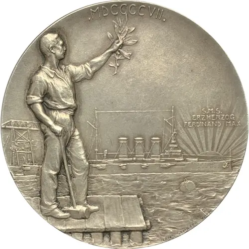 Man standing on a pontoon with an olive branch in one hand and a hammer in the other. In the background the shipbuilding establishment at Trieste, the battleship S.M.S. Erzherzog Ferdinand Max, sun with rays and a sea mine in the water. |