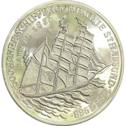 | Obverse lettering | 500 JAHRE SCHIFFERCOMPAGNIE STRALSUND.1488-1988. BARK UM 1850 |