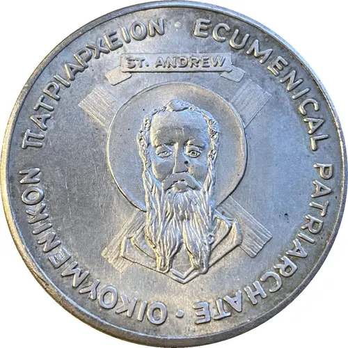 Bust of St Andrew with St Andrew`s Cross behind and inscription above; inscription in Greek and English around the edge. |