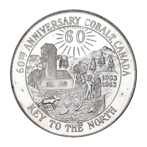 | Obverse lettering | 60TH ANNIVERSARY COBALT, CANADA 60 1903 1963 KEY TO THE NORTH |