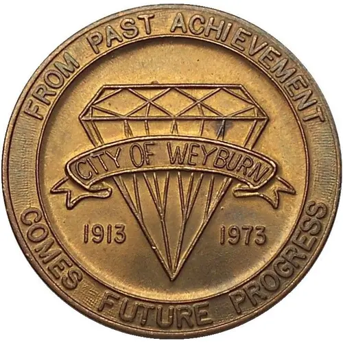 | Obverse lettering | FROM PAST ACHIEVEMENT CITY OF WEYBURN 1913 1973 COMES FUTURE PROGRESS |