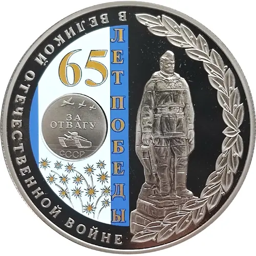 | 正面描述 | Right side: The monument `Alyosha` in the Bulgarian city of Plovdiv and an olive branch along the edge of the medal. Left side: The medal `For Bravery` on the background of a color image of the ribbon of this medal. A golden-colored salute and the inscription `65 years of Victory.` The inscription `In the Great Patriotic War` on the edge of the medal. |