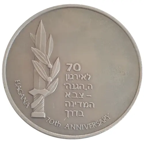 | Obverse lettering | 70 שנה לאירגון ה`הגנה` - צבא המדינה בדרך HAGANA 70th ANNIVERSARY |