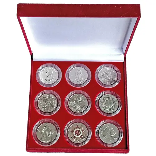 In the center are depicted the years of the Great Patriotic War, divided by the St. George ribbon. Below is the Eternal Flame. Along the circumference is the inscription - NO ONE IS FORGOTTEN, NOTHING IS FORGOTTEN. The stamp of the Moscow Mint. |