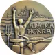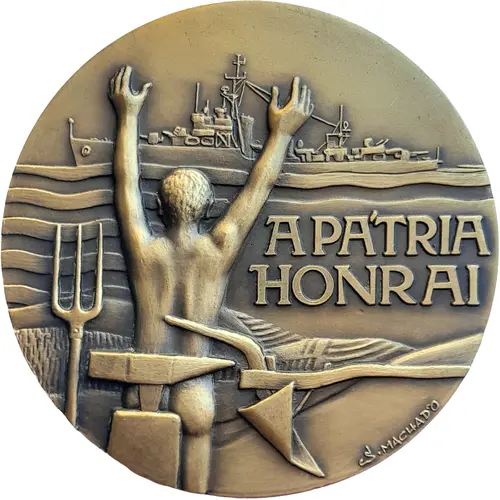 In the centre, a male figure with his back turned, naked from the waist up, with his arms raised towards a modern frigate, in a clear gesture of homage or salute. Prominently displayed on the right is the inscription in relief: ‘A PÁTRIA HONRAI’ (Honour the Fatherland) — evoking patriotic duty and the motto associated with the Navy. Elements of agricultural and industrial work are also present: A pitchfork (on the left) An anvil and a plough, reinforcing the connection between work, the sea and the land. Visible signature of the author: C. MACHADO |