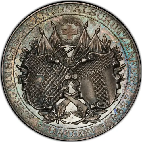 Two shields with coat of arms of Aargau and Baden. Radiate Confederation arms above. Four crossed flags, crossed rifles, crossbow, arrows, oak and laurel branches |