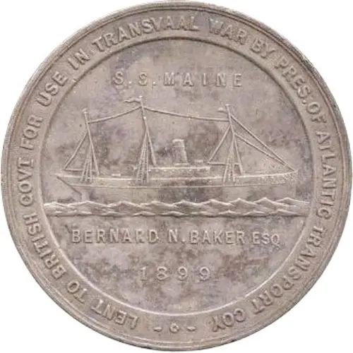 | Reverse lettering | S. S. MAINE BERNARD N.BAKER ESQ // 1899 LENT TO BRITISH GOVT FOR USE IN TRANSVAAL WAR BY PRES.OF ATLANTIC TRANSPORT COY |