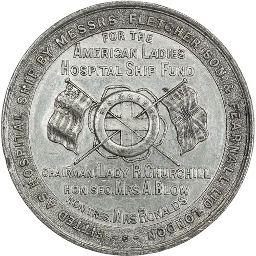 | Obverse lettering | FOR THE // AMERICAN LADIES // HOSPITAL SHIP FUND CHAIRMAN.LADY R.CHURCHILL // HON.SEC.MRS A.BLOW // HON.TRES.MRS RONALDS FITTED AS HOSPITAL SHIP BY MESSRS FLETCHER SON & FEARNALL Ltd. LONDON |
