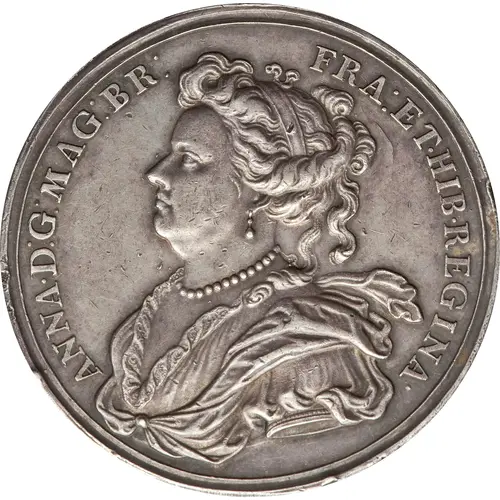 | Obverse description | Veiled bust of Queen Anne with pearl necklace and earrings facing left. |