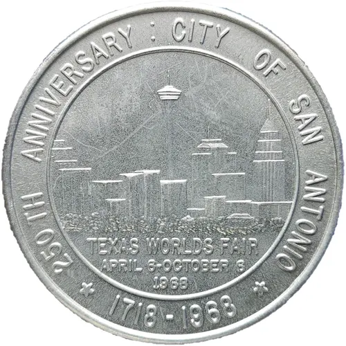 | Obverse lettering | 250 TH ANNIVERSARY : CITY OF SAN ANTONIO TEXAS WORLDS FAIR APRIL 6 - OCTOBER 6 1968 * 1718 - 1968 * |