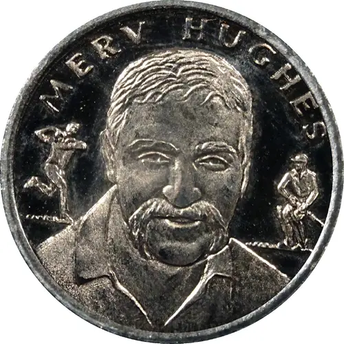 | Obverse description | Bust of Test Cricketer Merv Hughes with Bowler left and and a Batsman right. |