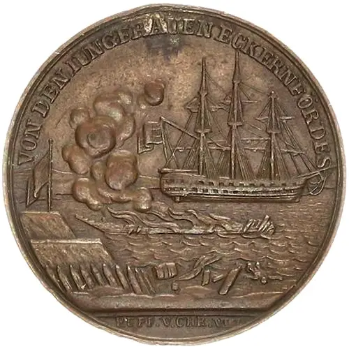 DEN TAPFEREN DEUTSCHEN KRIEGERN GEWIDMET ZERSTÖRUNG // D.DÄN.LINIENSCHIFFES // CHRISTIAN VIII // UND // EROBERUNG // DER FREGATTE // GEFION // ECKERNFÖRDE // 5. APRIL 1849 |