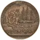 Coastal scene with ships in battle scene, one destroyed burning and sinking. Lettering above and in exergue |