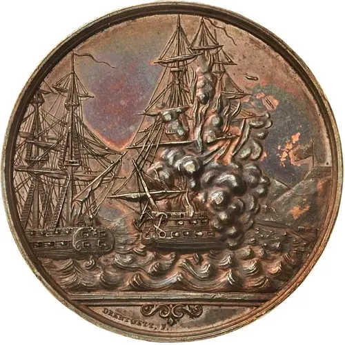 The frigate `Gefion` is sailing left far from the burning battleship `Christian VIII.` At right a three-lined flag is waving over a hill near the shore. Engraver`s name below the battle scene, in exergue. |