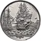 The frigate `Gefion` is sailing left far from the burning battleship `Christian VIII.` At right a three-lined flag is waving over a hill near the shore. Engraver`s name below the battle scene, in exergue. |