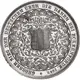 Three vertical lined shield within a complex floral decoration. Legend along rim. |
