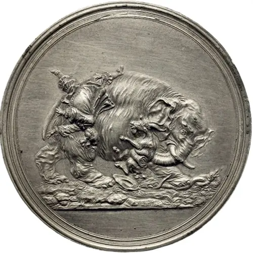 | Obverse description | An angry war elephant tramples a long snake and hits a capricorn with his trunk, lifting it off the ground. A man falls from the back of the elephant while his hat falls into the excrement of the capricorn. |