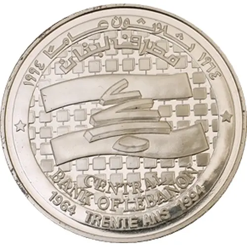 | Obverse lettering | ١٩٦٤ ثلاثون عاماً ١٩٩٤ مصرف لبنان CENTRAL BANK OF LEBANON ★ 1964 TRENTE ANS 1994 ★ (Translation: Bank of Lebanon Central Bank of Lebanon 1964 Thirty years 1994) |
