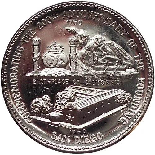 | Ön yüz lejandı | COMMEMORATING THE 200th ANNIVERSARY OF THE FOUNDING BIRTHPLACE OF CALIFORNIA 1969 SAN DIEGO LOMBARDO |