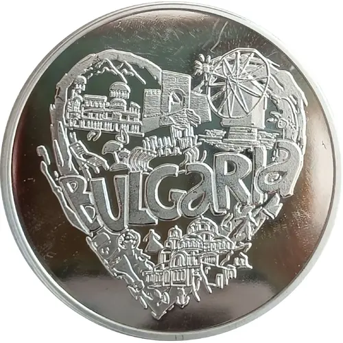 | Ön yüz açıklaması | Metal souvenir coin with relief, decorated with landmarks, nature and other Bulgarian motifs in the shape of a heart with the inscription Bulgaria |