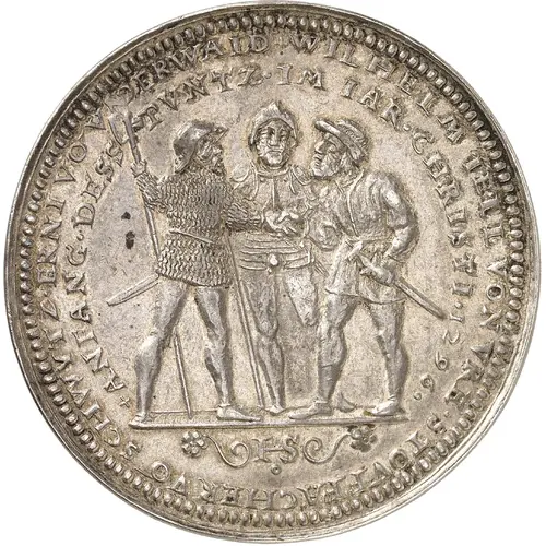 | نوشتههای روی مدال | + WILHELM TELL VON VRE · STOVFFACHER VO⁻ SCHWYZ · ERNI VO⁻ VNDERWALD + ANFANG · DESS PVNTZ · IM IAR · CHRISTI · 1296 · I-S (Translation: William Tell from Uri, Stouffacher from Schwytz, Erni from Unterwalden. Beginning of the confederation, in the year of the God 1296.) |