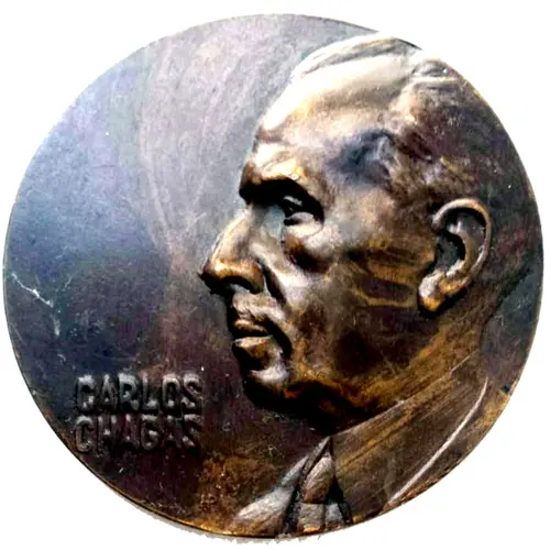 | Obverse description | Effigy in relief of the left profile of Carlos Chagas to the right of the field of the medal. On the lower left side, in relief, the words `CARLOS CHAGAS`. |