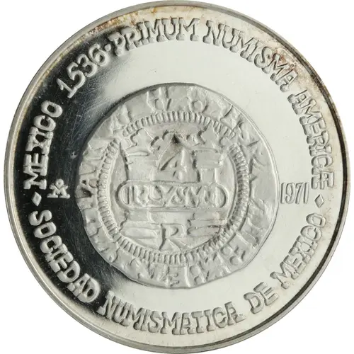 | Obverse lettering | MEXICO 1536 PRIMUM NUMISMA AMERICÆ 1971 SOCIEDAD NUMISMATICA DE MEXICO |
