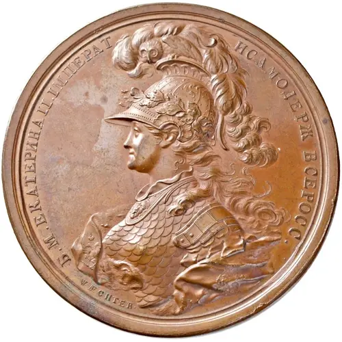 | Obverse description | Bust of Catherine personifying Minerva to left. |