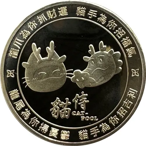 | Obverse lettering | 龍爪為你抓財運 貓手為你招福氣 貓侍 CAT -POOL 龍爪為你掃憂鬱 貓手為你招吉利 (Translation: The dragon`s claws bring you wealth, and the cat`s hands bring you luck. Cat-Pool. The dragon`s claws will sweep away your melancholy, while the cat`s hands will bring you good fortune.) |