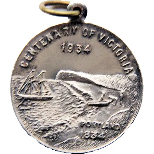 | Descripción del anverso | Scene of landing at Portland Bay; in ground below, PORTLAND / 1834; above, centenary of victoria / 1934 |