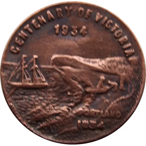 | Obverse description | Scene of landing at Portland Bay; in ground below, PORTLAND / 1834; above, centenary of victoria / 1934 |