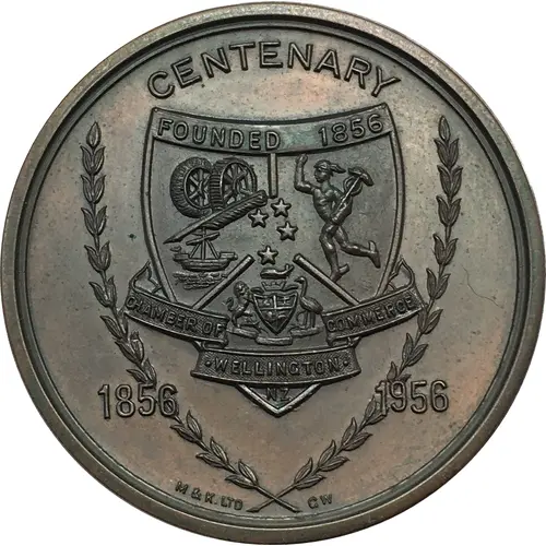 | Obverse lettering | CENTENARY FOUNDED 1856 CHAMBER OF / COMMERCE WELLINGTON 1856 / 1956 M & K. LTD / CW |