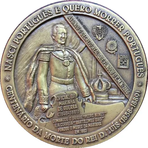 | Obverse lettering | NASCI PORTUGUÊS E QUERO MORRER PORTUGUÊS ASSINOU O DECRETO REAL QUE FUNDOU O C.M.N.-1866 CENTENÁRIO DA MORTE DO REI D.LUÍS (1838-1889) (Translation: I was born Portuguese and I want to die Portuguese Signed the Royal Decree that Founded C.M.N.-1866 Centenary of the Death of King D. Luis (1838-1889)) |