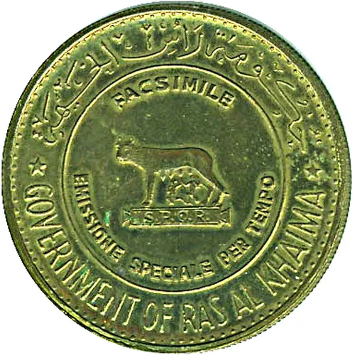 | Obverse lettering | ★ حُكُومَةُ رَأسِ الخَيمَة ★ FACSIMILE S.P.Q.R. EMISSIONE SPECIALE PER TEMPO GOVERNMENT OF RAS AL KHAIMA (Translation: Government of Ras al-Khaimah Replica SPQR (Senātus Populusque Rōmānus) = The Senate and People of Rome Special issue in time) |