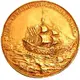 Warship sailing to right, under full sail and with sailors on deck and in the rigging; on the left, seashore with fortress. |