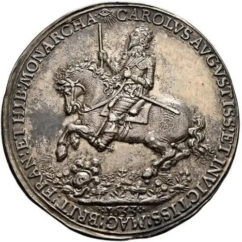 | Descripción del anverso | (fr) Equestrian figure of Charles I riding left, holding an upright baton. |
