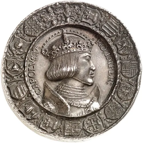 Obverse description Bust of Emperor Charles V, wearing crown, armour, and order of the golden fleece. Pillars of Hercules with motto above. 14 coats of arms around, clockwise: Kingdom of Castille, Kingdom of Aragon, Kingdom of León, Kingdom of Naples, County of Tyrol, Kingdom of Sicily, Kingdom of Jerusalem, Kingdom of Seville, New Castille, Kingsom of Galicia, Kingdom of Valencia, Kingdom of Toledo, Kingdom of Granada, and Kingdom of Navarre