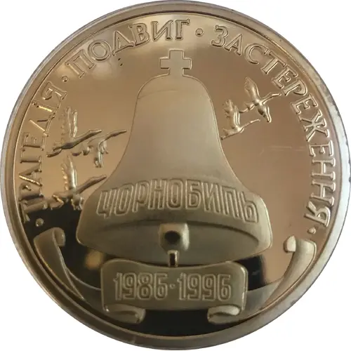 | Obverse lettering | ТРАГЕДЇЯ ПОДВИГ ЗАСТЕРЕЖЕННЯ ЧОРНОБИЛЬ 1986 - 1996 (Translation: Accident at the Chernobyl Nuclear Power Plant 26 April 1986) |