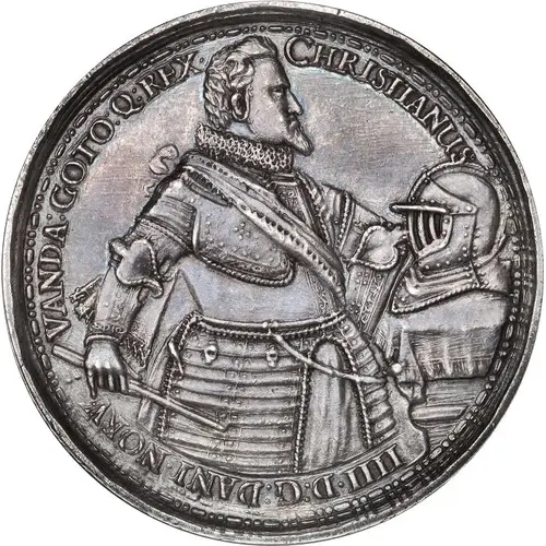 | Descrizione del dritto | Armored standing figure of King Christian IV facing right. King has both hands on his hips with the right holding a scepter (or a stick). Helm is on a table in front of King. |