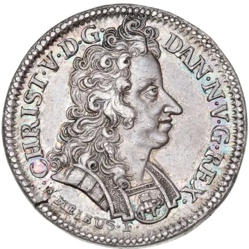 Bust of King Christian V with long and curly hair facing right. Engraver sign below bust. |