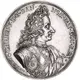 Armored and mantled bust of King Christian V with long and curly hair facing right. King armor has a floral ornaments on the shoulder and a band with the pendant of the Order of the Elephant. |