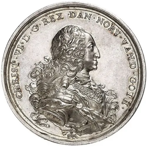 CHRIST • VI • D • G • REX • DAN • NORV • VAND • GOTH • • G • W • W • (Translation: Christian VI Dei Gratia King of Denmark, Norway, the Wends and the Goths) |